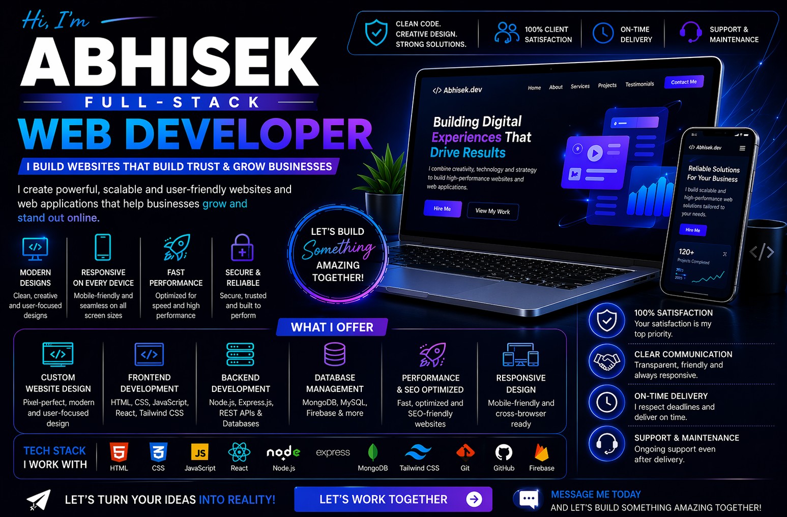 Hi! I'm Abhisek Panda, and I'm a passionate Web Developer student with a keen interest in many domains like MERN & Frontend Development. I love transforming ideas into reality with innovative solutions and am always eager to learn new skills, tools, and concepts.